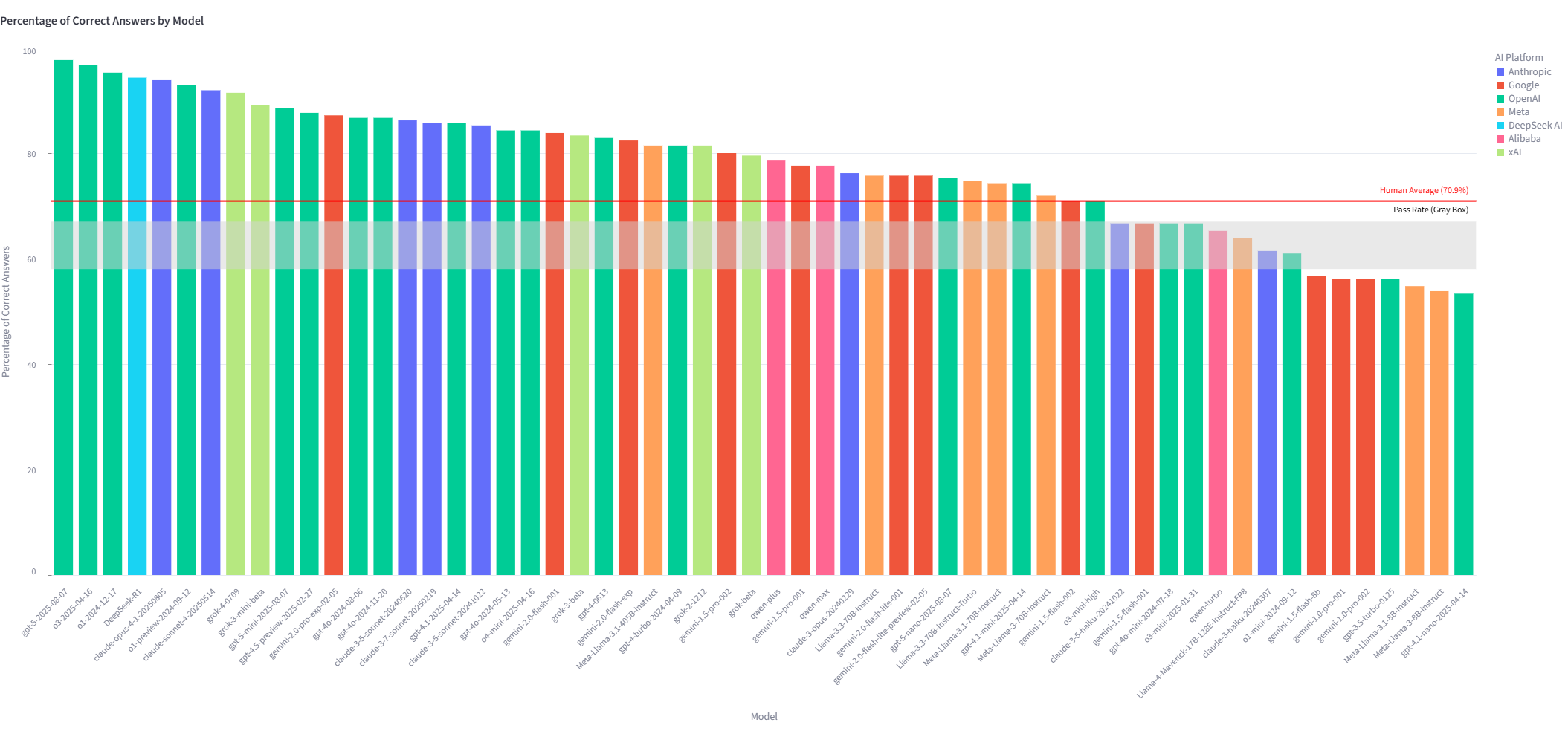 What happens when you sit today’s most advanced AI models down with a stack of bar exam questions? That’s exactly what we wanted to find out. Our team tested 59 different large language models (LLMs)—from companies like OpenAI, Google, Anthropic, Meta, and more on a practice Multistate Bar Exam (MBE) questions. For the non-lawyers, the MBE section of the bar exam is 200 multiple choice questions that equally cover Civil Procedure, Contracts, Evidence, Torts, Constitutional Law, Criminal Law and Procedure, and Real Property. The multiple choice format makes it much easier to quickly evaluate whether an A.I. is answering correctly. You can explore the data at the data dashboard located at https://ai-mbe-study.streamlit.app/.