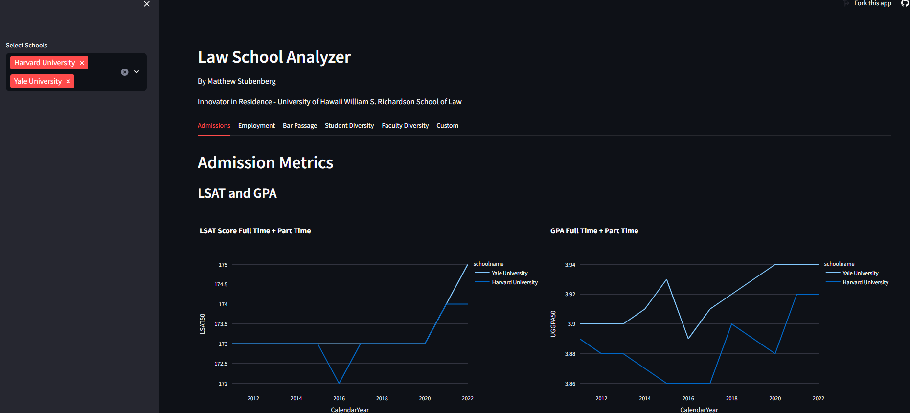 I was looking through the ABA disclosure data trying to compare different law school metrics over time and couldn't find a good app out there to do this. I've was also meaning to build a test app using the new python framework streamlit and thought this was the perfect excuse. The result is a streamlit app using all the law school aba disclosure data that easily lets you compare different law schools by any metric they are required to report. For instance you can see average entering LSAT scores over time and compare those number to other schools in the area. Check it out at https://lawschool.streamlit.app/